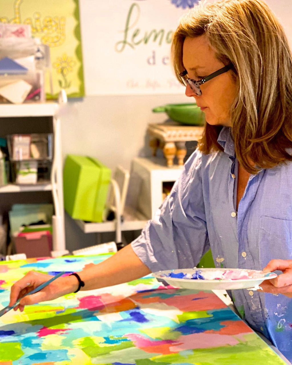 Lemondaisy Design sells hand painted linens, canvas art, paper goods and baby items featuring her designs online and to specialty shops across the country.