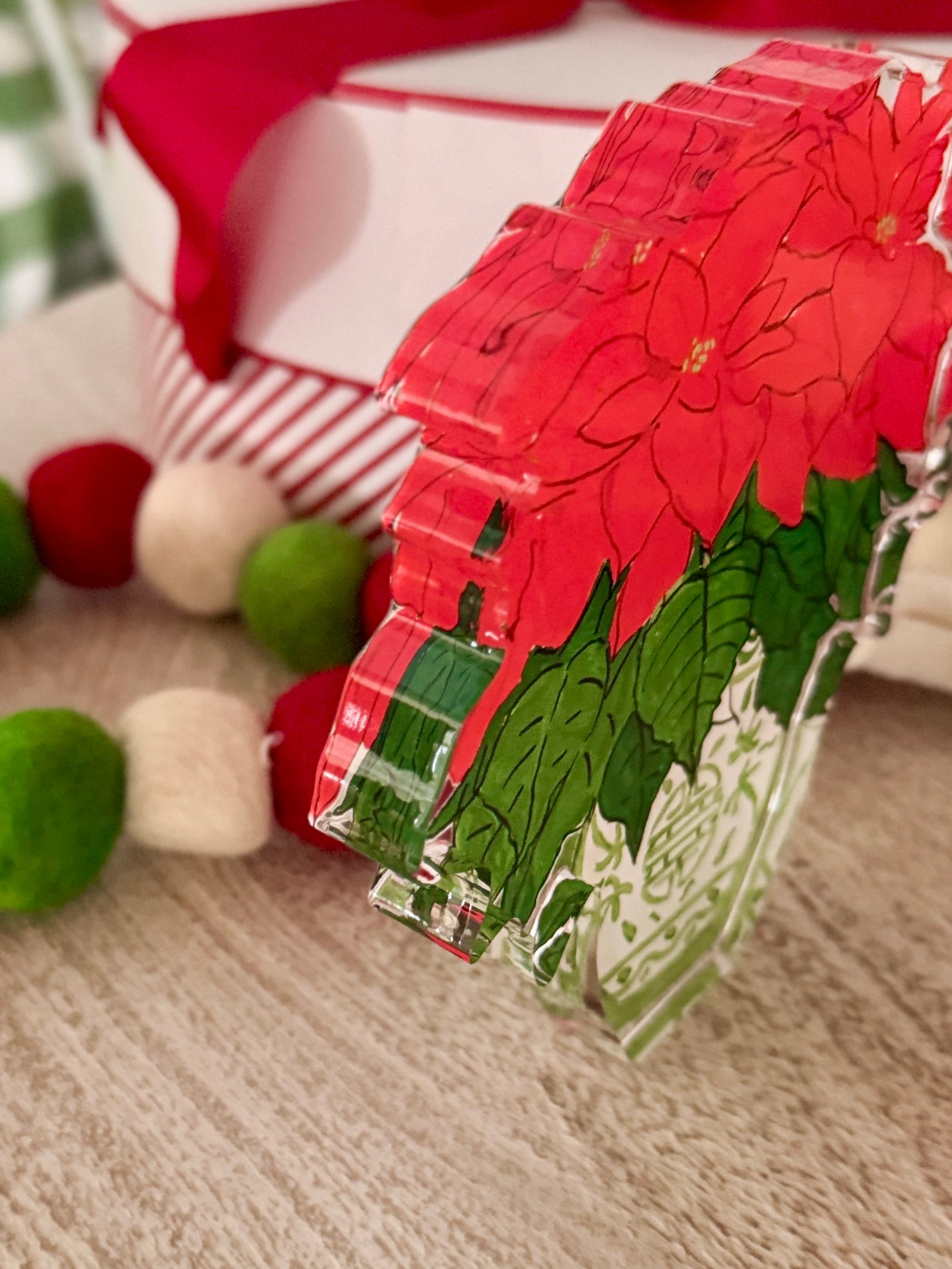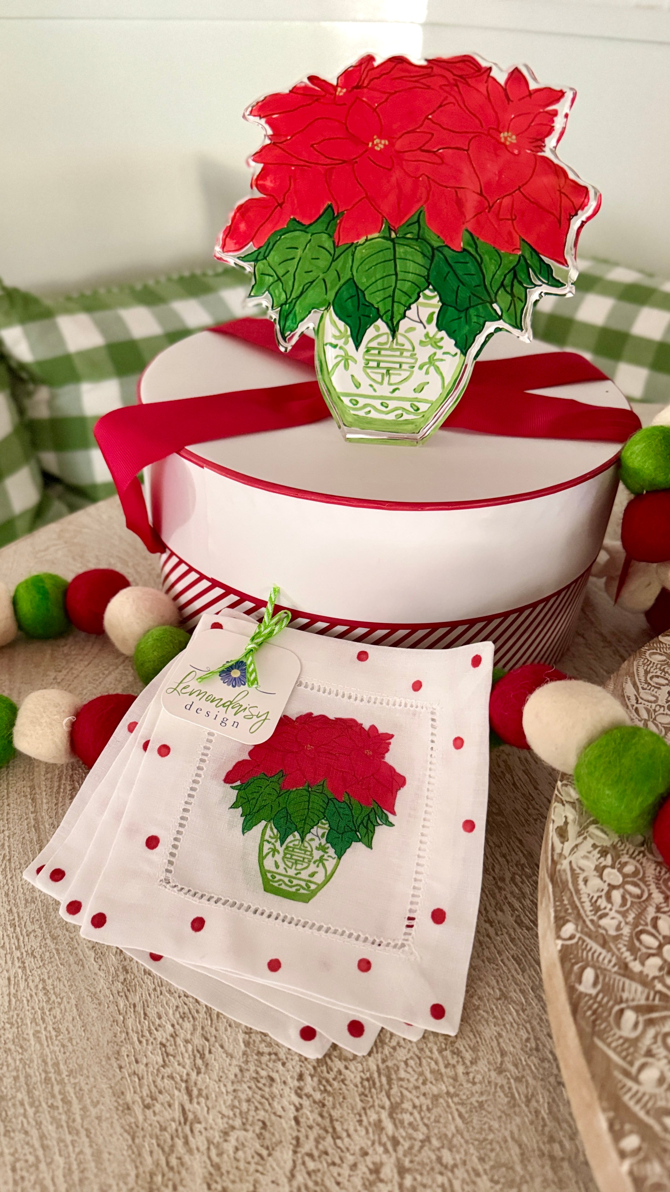 Beautiful red poinsettia in a green chinoiserie jar on a acrylic block. Perfect addition to your Chinoiserie Christmas decor or to give to your chinoiserie loving bestie!