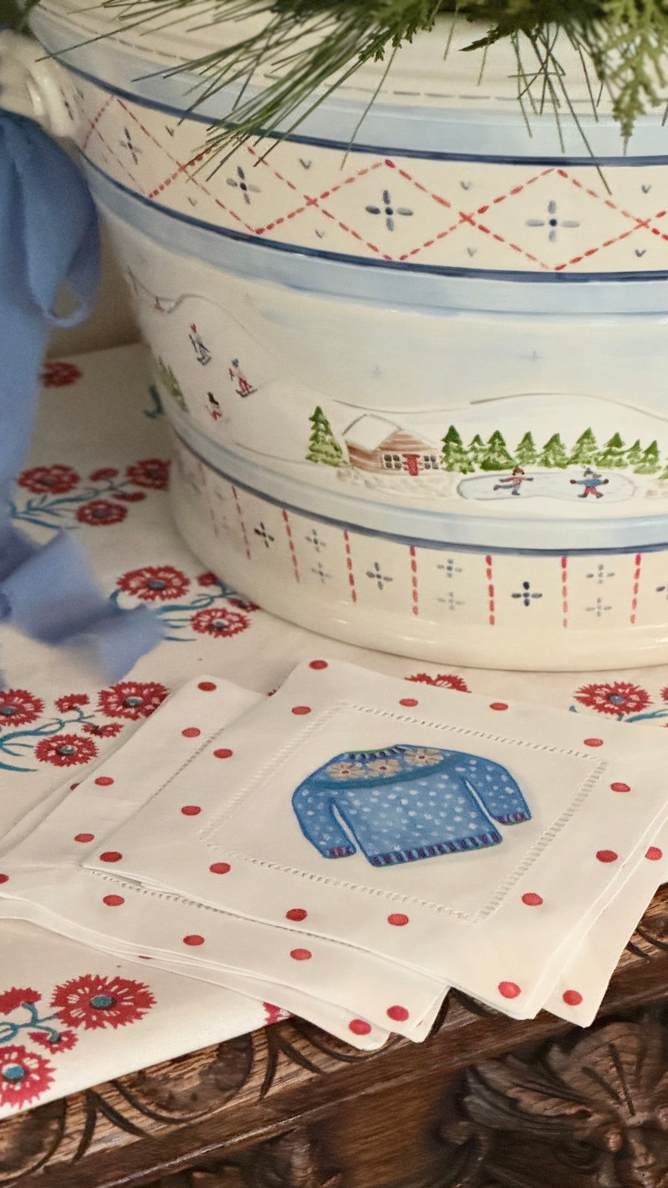Blue and White Snow Fun linen cocktail napkins to enjoy Apres Ski! Each set features 4 designs...skis, skates, sweater and hat. Perfect hostess, housewarming, xmas, secret santa and white elephant gift ideas.