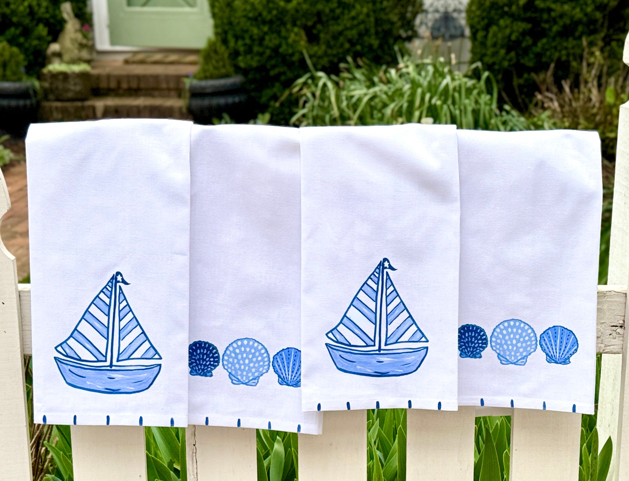 Perfect for the beach lover! # blue shells in shades of blue will brighten up your kitchen and make a wonderful gift. Design is printed onto towel and stripes are hand painted. Personalize to make a great housewarming, hostess, or birthday gift. Looks great with our blue and white sailboat towel.