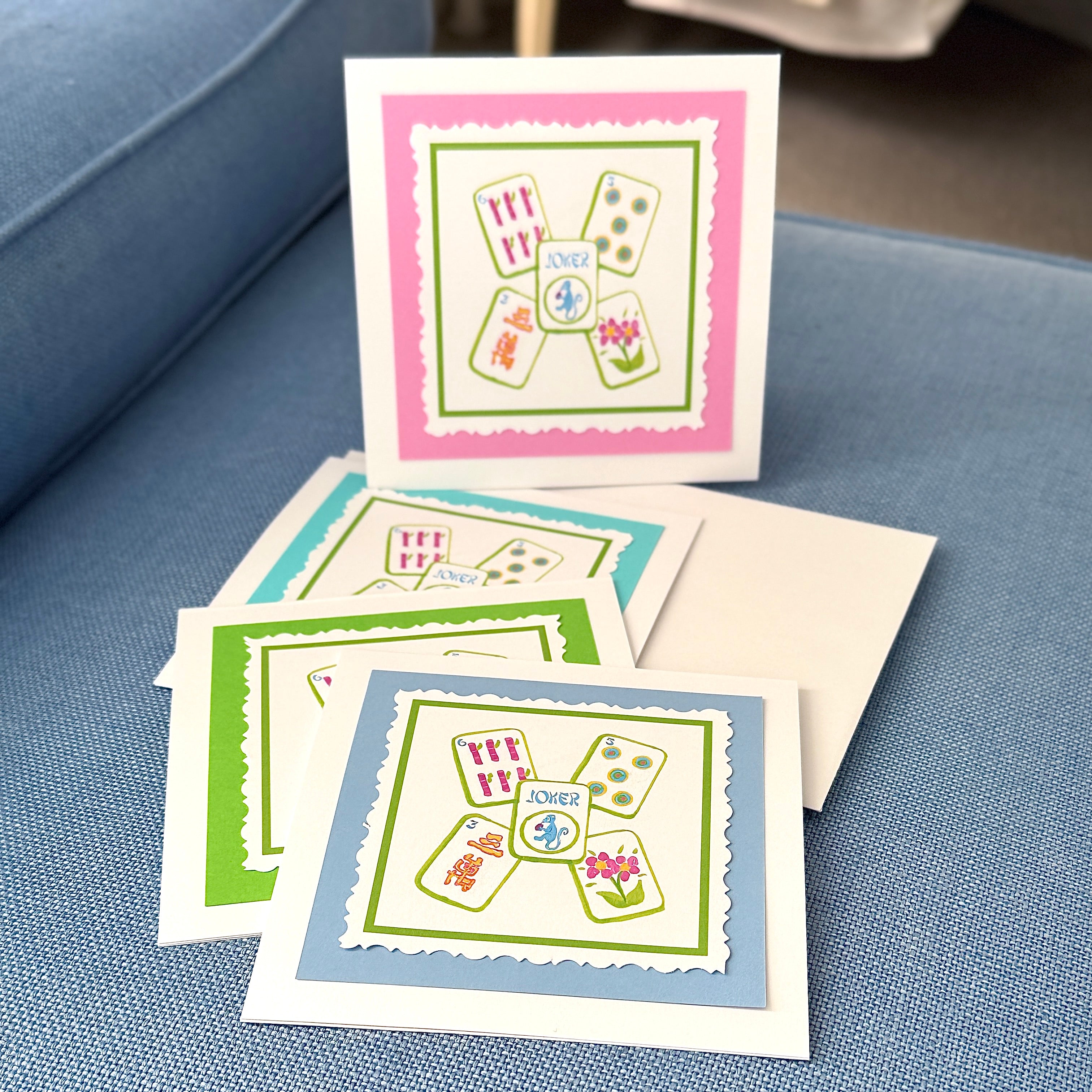 Calling all Mahjong lovers! These adorable hand cut and colorful cards are sure to score you a win! Purchase as a gift for the Mahjong lover and for yourself! They are blank inside and offer the perfect way to say hello, thank you or thinking of you.