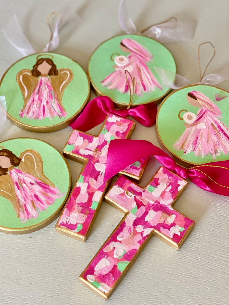 These beautiful custom designed hand painted Pink Holiday ornaments are sure to be a stunner on the tree! They are hand painted on paper mache in various shades of pink. They make a fabulous hostess and Christmas gift or a special gift for a new baby girl