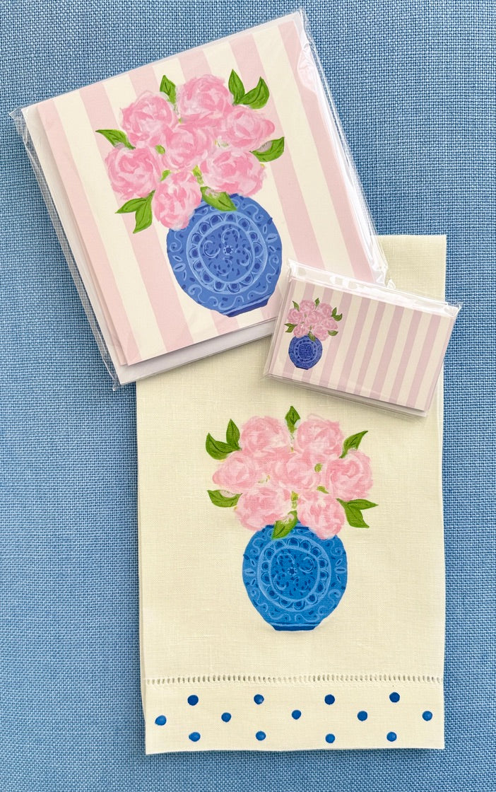 A linen guest towel will accent your bathroom with a blue chinoiserie ginger jar full of pink peonies. Design is on white linen with hand painted polka dots are perfect for your bath or powder room. A great gift idea for a housewarming present and make a perfect hostess gift.