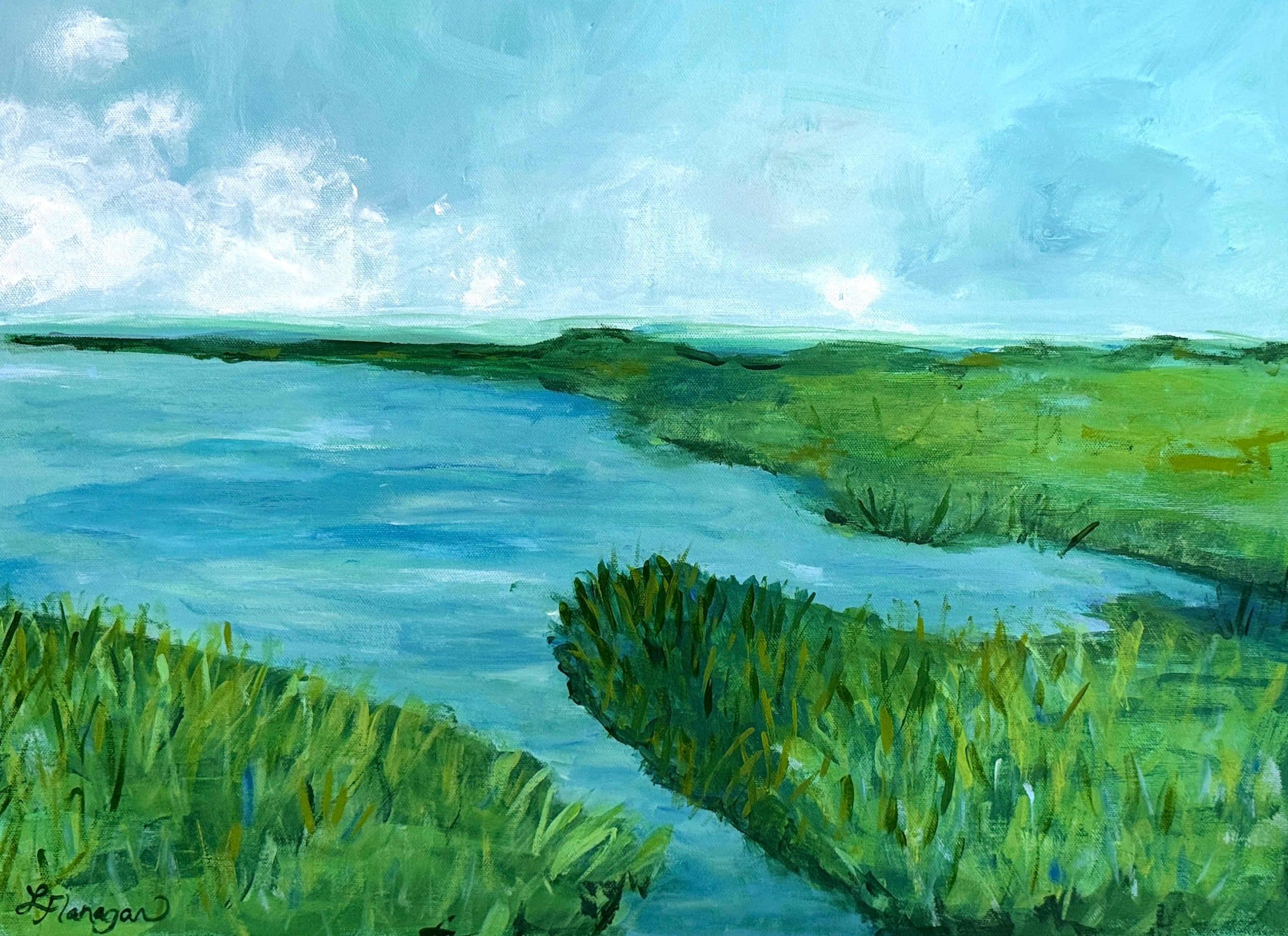 I love spending time in the low country of South Carolina. This view is from a photo I took at Fripp Island combined with memories of areas of Isle of Palms. I love watching the ever changing tides, light and birds on the marsh.