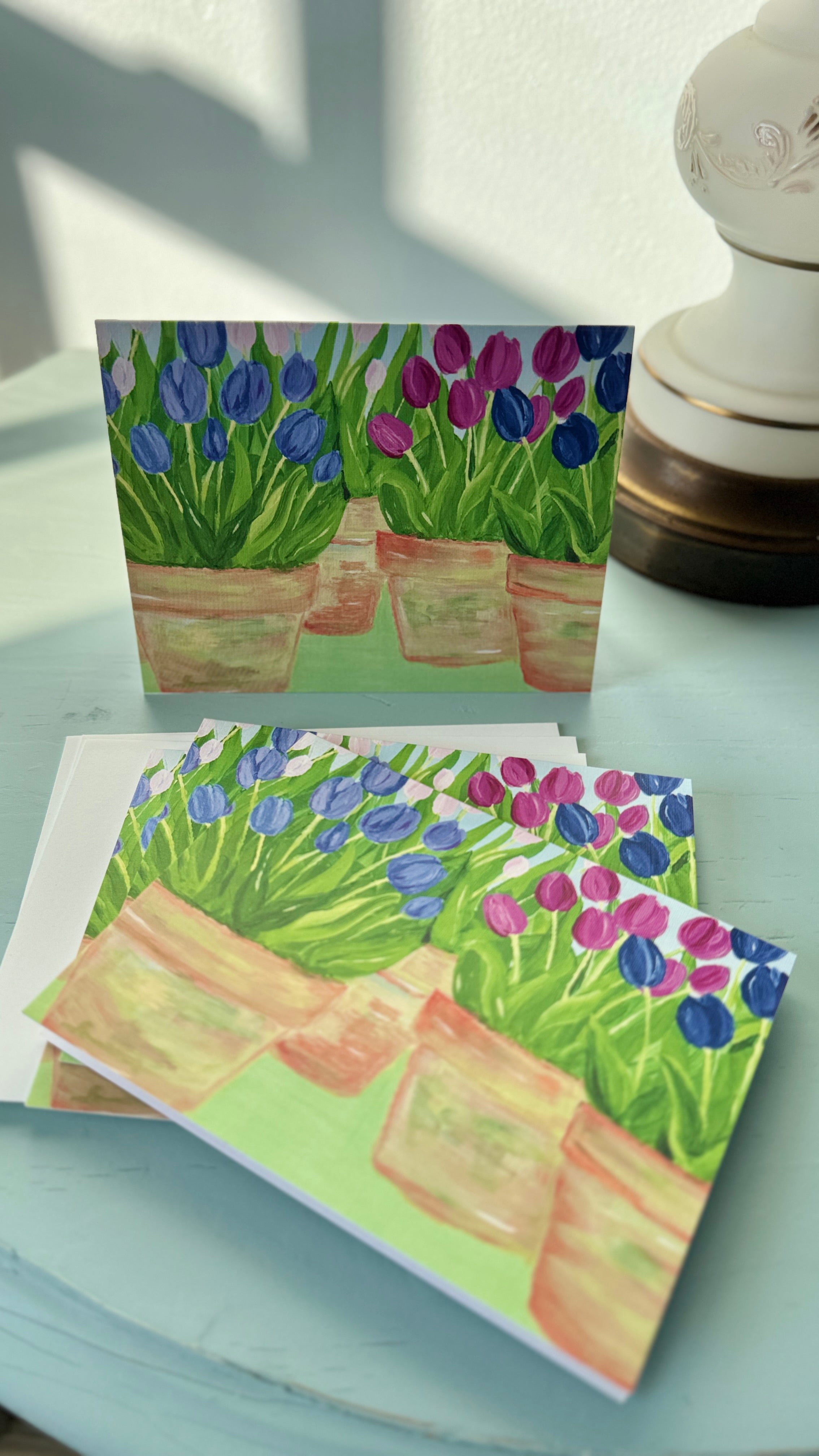 Bloom with every note! These beautiful floral notecards feature a print of my original painting of tulips in terra cotta pots and will leave a lasting impression with every well wish. They make a perfect hostess or housewarming gift and don't forget to get some for yourself too!